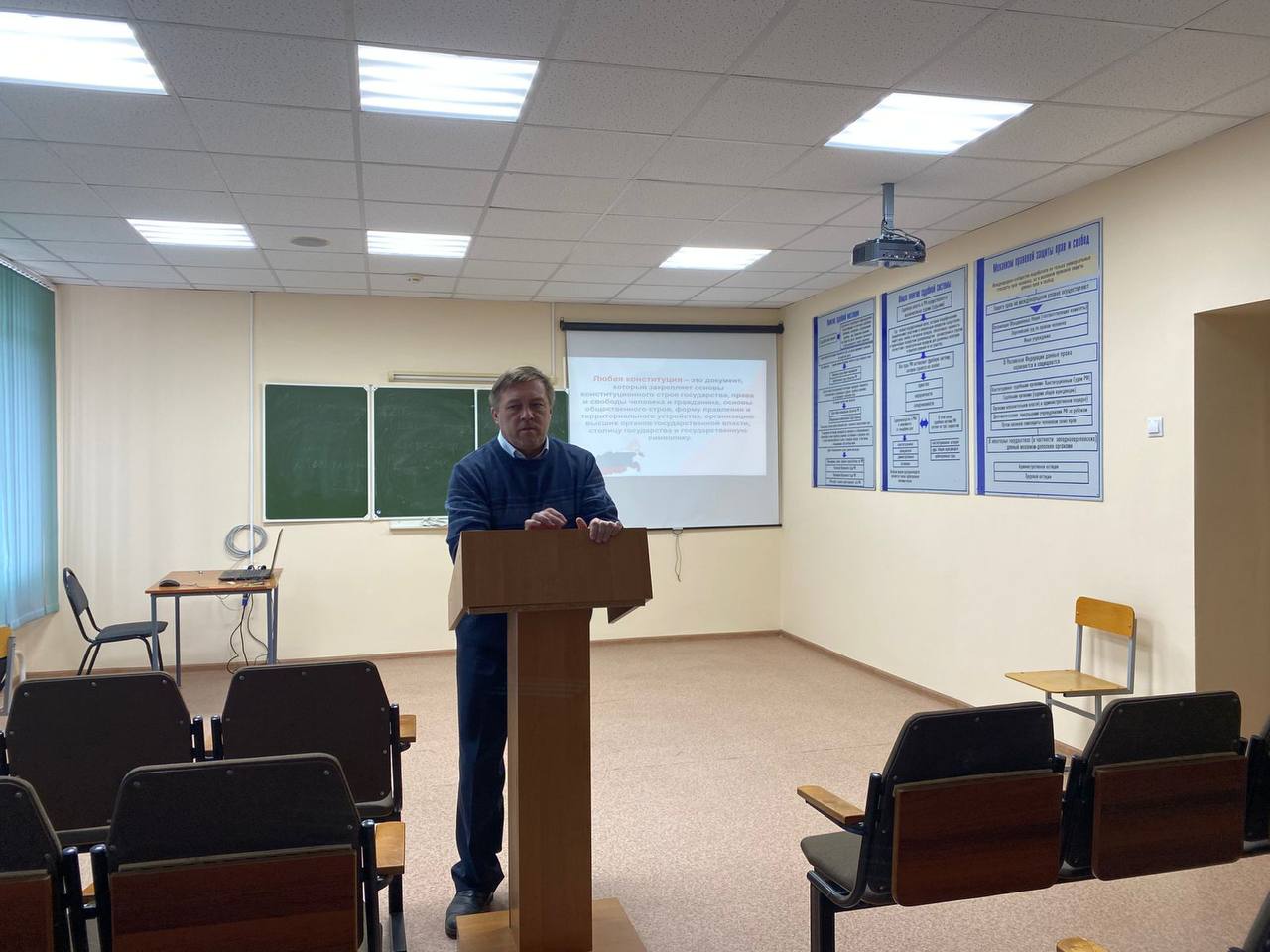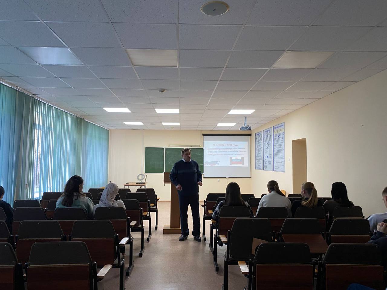 12 декабря 2024 года преподаватель кафедры юридических дисциплин Ковалев В.В. провел лекцию, посвященную основам конституционного строя РФ. Студенты разных групп и курсов принимали участие в мероприятии. Лекция носила характер воспитательно-поучительной встречи. Студенты обсуждали основной закон государства, его важность и ключевую роль формирования демократии в стране.